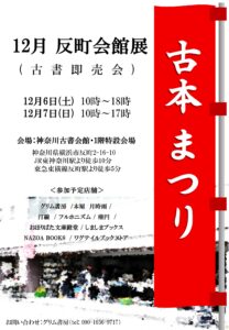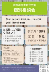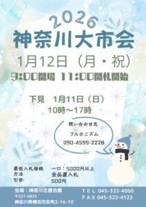お知らせ・即売会情報 【組合員限定】2026神奈川大市会の開催概要 2025-12-04 「2026神奈川大市会」 日時: 大市 Read More » 港北古書フェア(12月) 2025-12-03 会場:有隣堂センター南駅店店頭ワゴン販売 Read More » 反町古書会館展(12月) 2025-12-03 期間:12月6日(土) 10時〜18時 Read More » 神奈川古書組合主催 個別相談会 2025-11-19 古物商免許取得や古書店開業の第一歩、まず Read More » 記事一覧 組合加盟案内神奈川県古書組合では、組合員を募集しています。 ご興味のある方はこちらをご覧ください。 加盟店一覧神奈川古書組合に加盟する古書店一覧です。 神奈川県古書組合について神奈川県古書組合の沿革や事業内容をご案内しています。 古本・古書の買い取り古本・古書の買い取りなら神奈川古書組合加盟の古書店まで。 古書会館スケジュール アクセス 〒221-0825 神奈川県横浜市神奈川区反町2丁目16−10 神奈川古書会館内