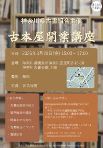 お知らせ・即売会情報 古本屋開業講座(3月) 2026-02-21 3月20日に古本屋講座を開催します。 参 Read More » 反町古書会館展(3月) 2026-02-20 期間:3月14日(土) 10時〜18時 Read More » 神奈川の催事情報(3月〜4月) 2026-02-20 2026年3月から4月の催事・即売会情報 Read More » 港北古書フェア(2月) 2026-01-23 会場:有隣堂センター南駅店店頭ワゴン販売 Read More » 記事一覧 組合加盟案内神奈川県古書組合では、組合員を募集しています。 ご興味のある方はこちらをご覧ください。 加盟店一覧神奈川古書組合に加盟する古書店一覧です。 神奈川県古書組合について神奈川県古書組合の沿革や事業内容をご案内しています。 古本・古書の買い取り古本・古書の買い取りなら神奈川古書組合加盟の古書店まで。 古書会館スケジュール アクセス 〒221-0825 神奈川県横浜市神奈川区反町2丁目16−10 神奈川古書会館内